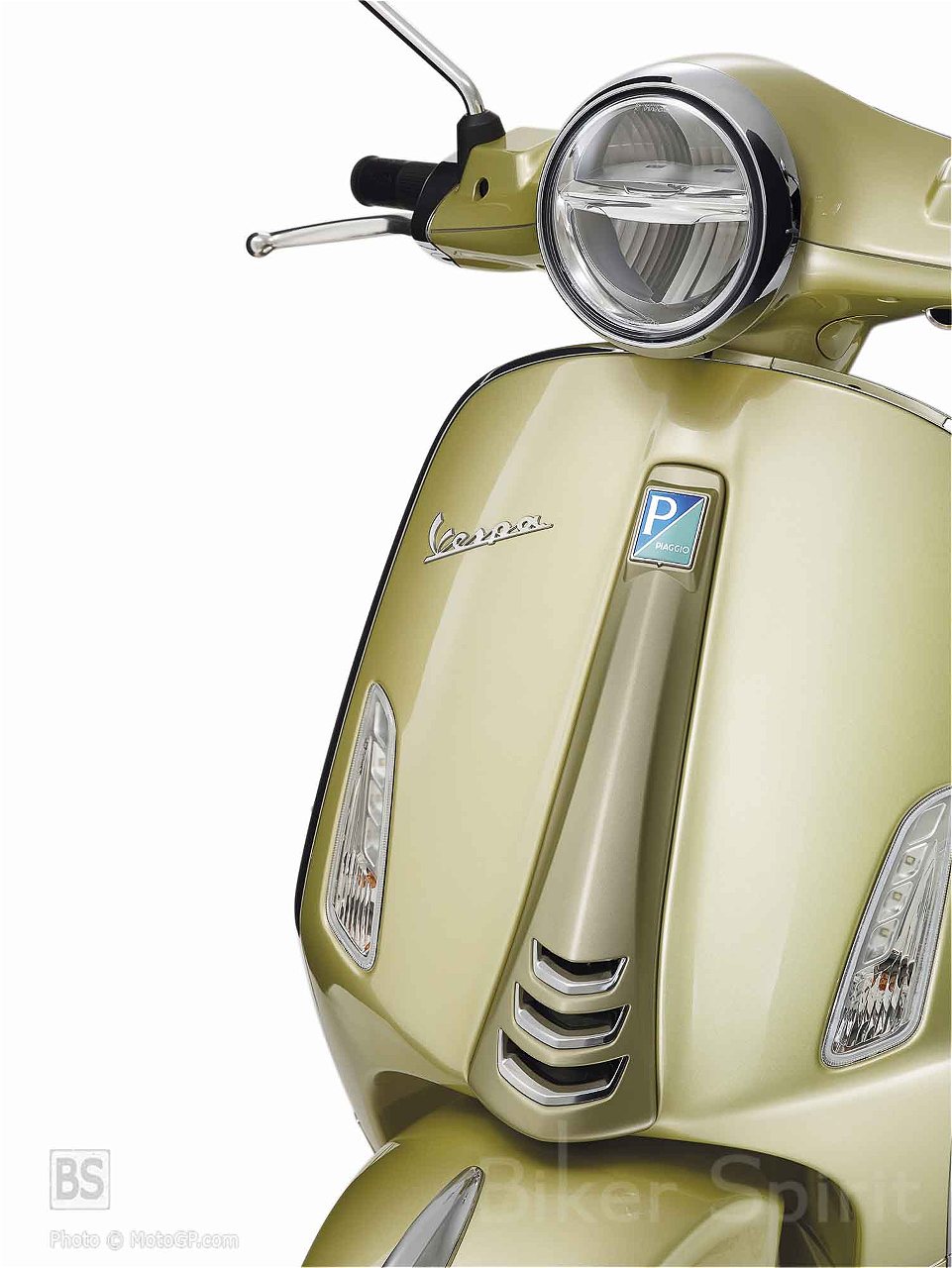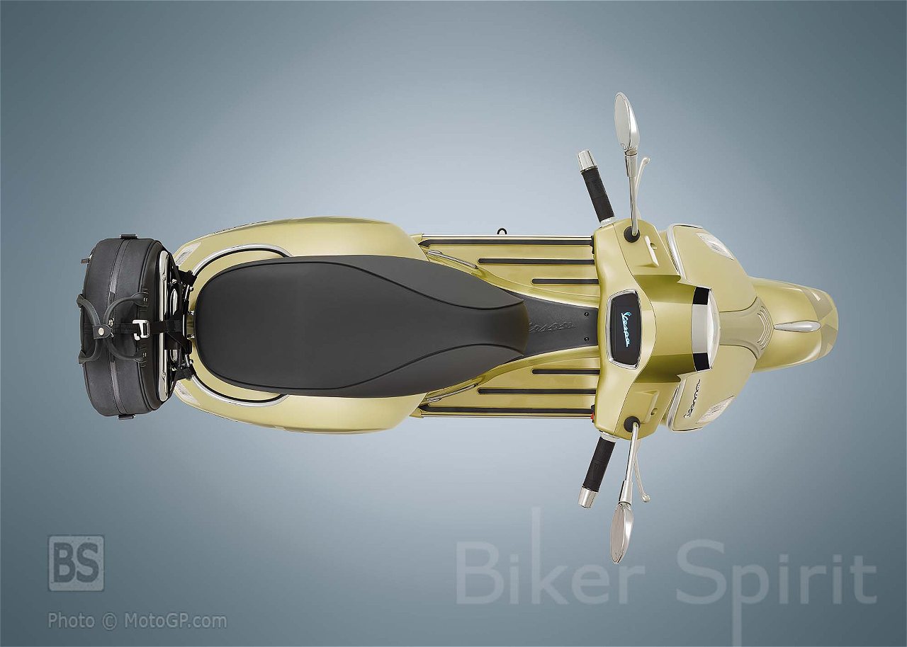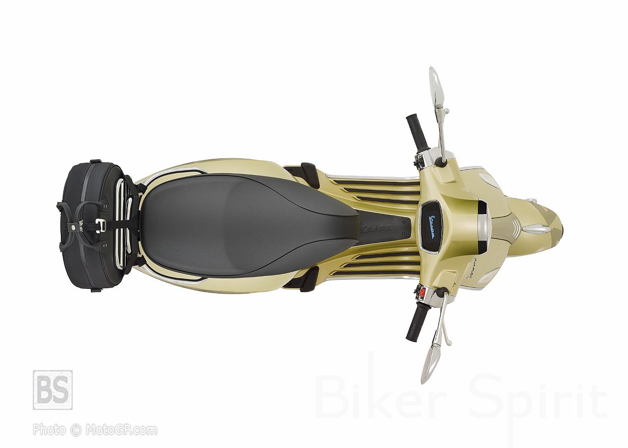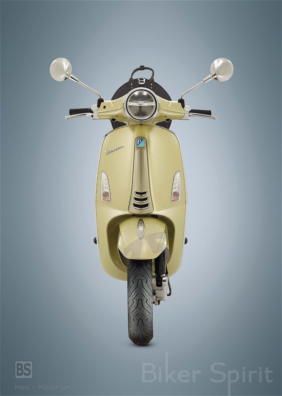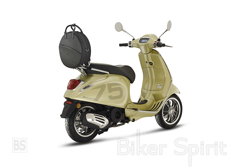 Στα πλαϊνά καπάκια και το μπροστινό φτερό εμφανίζεται ο αριθμός 75 με μια ελαφρώς σκούρα σκίαση, δημιουργώντας ένα κομψό εφέ διχρωμίας, το οποίο επαναλαμβάνεται στο μπροστινό μέρος του σκούτερ, με την παραδοσιακή “γραβάτα” να είναι βαμμένη στο ματ κίτρινο χρώμα “Giallo Pirite”.