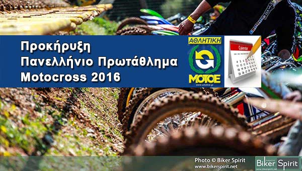 Η Αθλητική ΜΟΤ.Ο.Ε για το 2016, προκηρύσσει Πανελλήνιο Πρωτάθλημα MOTOCROSS (ΜΧ) αποτελούμενο από 7 αγώνες σύμφωνα με το παρακάτω πρόγραμμα :