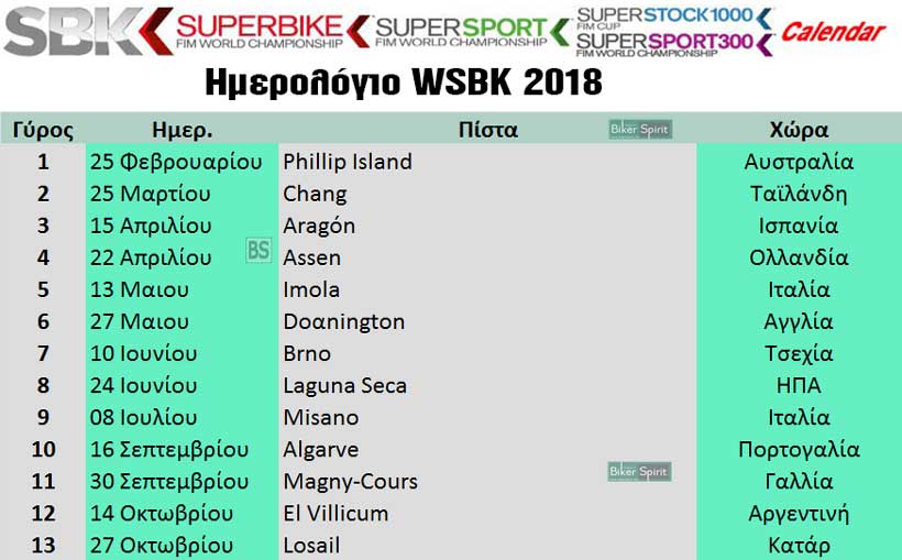 Το ημερολόγιο WorldSBK του 2018 έχει ως εξής: