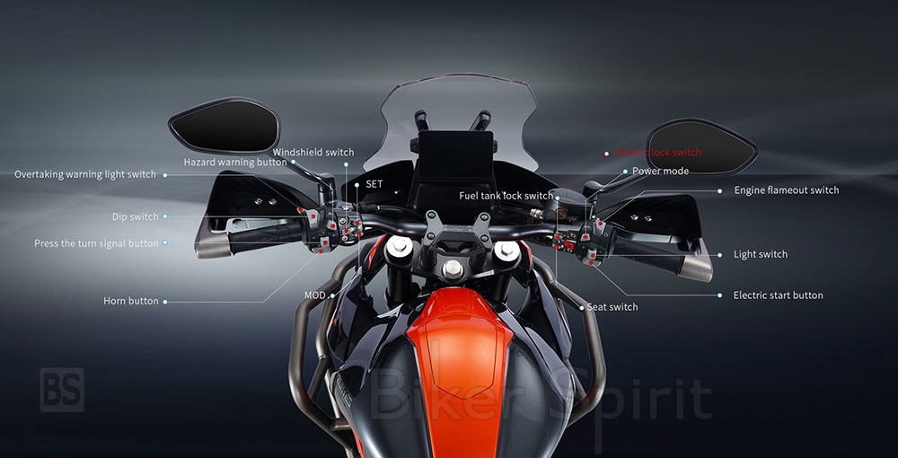 Τα φωτιστικά σώματα είναι όλα τεχνολογίας LED, προσφέροντας ένα φυσικό και απαλό φωτισμό, με μεγάλη διασπορά δέσμης και μεγάλη διάρκεια ζωής. Η έγχρωμη οθόνη υψηλής ανάλυσης και φωτεινότητας (HD – HB) διαθέτει αυτόματη ρύθμιση επιπέδου φωτεινότητας, ανάλογα με τις συνθήκες φωτισμού στο περιβάλλον και τέσσερα διαφορετικά interfaces για να επιλέξει ο αναβάτης αυτό που προτιμά, με ξεχωριστή θεματική προσέγγιση το καθένα. Πέρα από τις στάνταρ πληροφορίες που διαθέτει, συμπεριλαμβάνονται επίσης η ένδειξη θερμοκρασίας και πίεσης των ελαστικών, χάρη στους αισθητήρες του TPMS. Πρόκειται για μια γερμανικής προέλευσης τεχνολογία αισθητήρων, που προειδοποιεί στην οθόνη όταν διαγνώσει πίεση εκτός προδιαγραφών στα ελαστικά (μικρότερη ή μεγαλύτερη) όπως και για υπερβολική θερμοκρασία και για απότομη απώλεια αέρα.