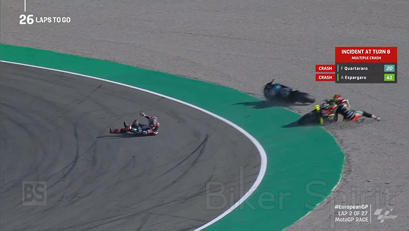 O Alex Marquez είχε πτώση στους τελευταίους γύρους του αγώνα, όπως και ο Bagnaia είχε πτώση, ο Crutchlow και ο Aleix Espargaro!