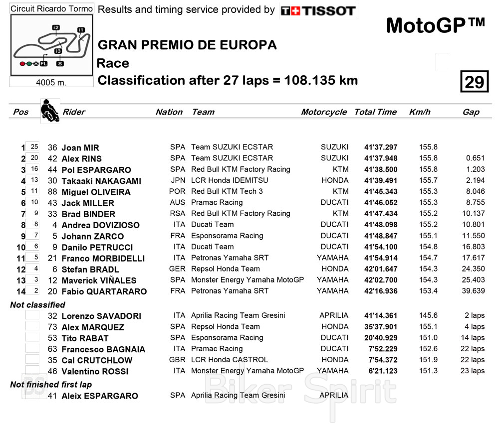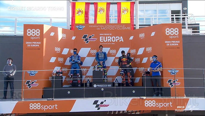 Το βάθρο έκλεισε ο Pol Espargaro με το πρώτο ΚΤΜ που ξεκίνησε από την Pole position Και οδήγησε τους πρώτους γύρους, αλλά δεν κατάφερε να αντισταθεί στην επιθέσεις των 2 Suzuki και έτσι αρκεστεί στην τρίτη θέση, κλείνοντας το βάθρο της Valencia 1.
