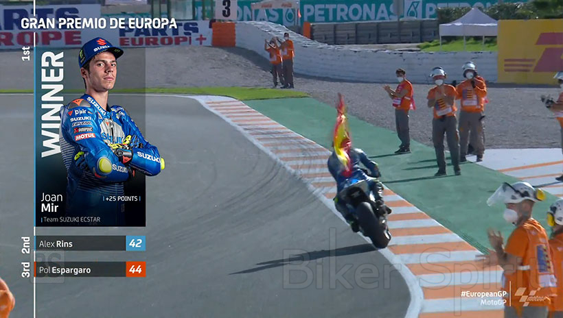 Ο Joan Mir κατάφερε να πάρει επιτέλους την πρώτη του νίκη στην μεγάλη κατηγορία MotoGP, που τόσο ήθελε, ανοίγοντας την διαφορά του στο πρωτάθλημα στους 37 βαθμούς από τους Quartararo και Rins! Ο Joan Mir έγινε ο 9ος νικητής της σεζόν!
