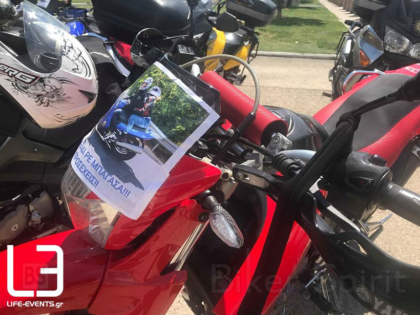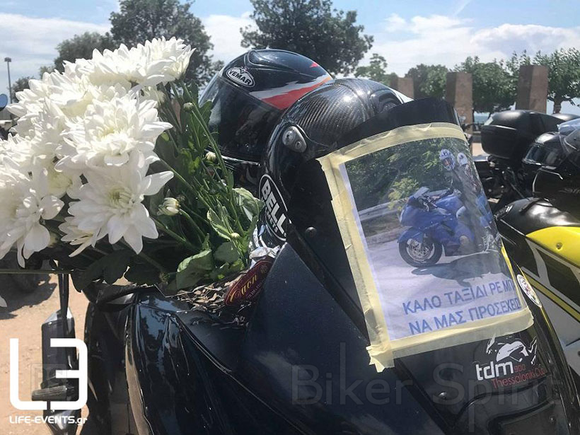 Περίπου 100 δικυκλιστές συγκεντρώθηκαν μπροστά στο Λευκό Πύργο, νωρίς το μεσημέρι της Τρίτης, έχοντας πάνω στις μηχανές τους φωτογραφία του άτυχου οδηγού που γράφει «Καλό ταξίδι μπαγάσα, να μας προσέχεις», λουλούδια και μαύρες κορδέλες.