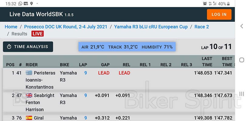 “Πήγα καλά στο βρεγμένο, αλλά από το ξεκίνημα στον 2ο Αγώνα στο στεγνό η Yamaha R3 μου έδωσε μεγάλη αυτοπεποίθηση. Παρά το ότι έχασα 3” σε ένα αγωνιστικό συμβάν, κατάφερα να είμαι μισό δευτερόλεπτο ταχύτερος από το πρώτο γκρουπ. Τους πέρασα όλους και στον τελευταίο γύρο ξαναπέρασα μπροστά στην προτελευταία στροφή. Απογοητεύτηκα από την αντιαθλητική κίνηση του Giral, έχασα τη νίκη για 4 δέκατα και μάλιστα δεν τιμωρήθηκε ο συναθλητής μου. Αυτά έχουν οι αγώνες, τώρα θα προετοιμαστώ για το Άσσεν της Ολλανδίας που τρέχω στα τέλη Ιουλίου”.