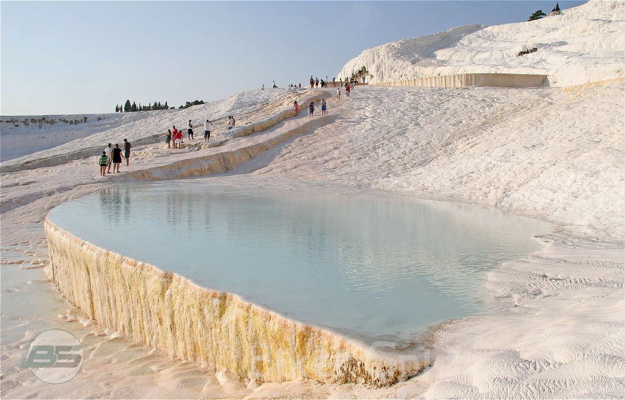 Στο Pamoukkale (ετυμολογικά σημαίνει «Φρούριο από Βαμβάκι»), μια ολόκληρη λοφοπλαγιά ήταν ντυμένη στα λευκά. Όχι με χιόνια, αλλά από την μακροχρόνια εναπόθεση των ασβεστούχων αλάτων που υπάρχουν στις θερμές ιαματικές πηγές της περιοχής. Αυτό είχε ως αποτέλεσμα να σχηματιστεί ένα –μοναδικό στον κόσμο– πάλλευκο σκηνικό με μικρούς καταρράχτες και αβαθείς φυσικές δεξαμενές. Το Pamoukkale ήταν όλα τα λεφτά…