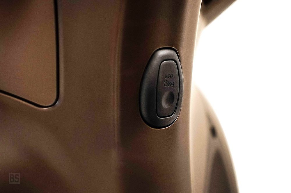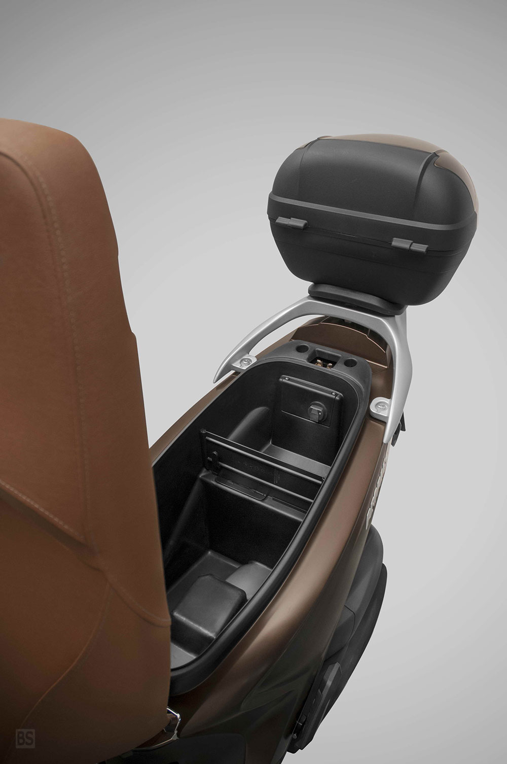 Ένα νέο πατενταρισμένο υπο-πλαίσιο στήριξης του κινητήρα -οριζόντιας διάταξης- υπόσχεται βελτιωμένη σταθερότητα όταν το scooter κινείται με υψηλές ταχύτητες. Ο τροχός μπροστά παραμένει στις 16”, ενώ ο αντίστοιχος πίσω είναι στις 14” προκειμένου να εξοικονομηθεί ο απαραίτητος χώρος κάτω από τη σέλα, όπου πλέον μπορούν να φιλοξενηθούν full face κράνος και αρκετά άλλα αντικείμενα. Υπάρχει μάλιστα και αφαιρούμενο διαχωριστικό που επιτρέπει να μεταβάλλεται ο χώρος αυτός ανάλογα με τις απαιτήσεις μεταφοράς και να εμποδίζεται η αθέλητη μετακίνησή των αντικειμένων. Τη νύχτα φωτίζεται από ένα φωτιστικό LED και διαθέτει μια δεύτερη θύρα USB (η πρώτη βρίσκεται στο τιμόνι) για φόρτιση μεγαλύτερων ηλεκτρονικών συσκευών.