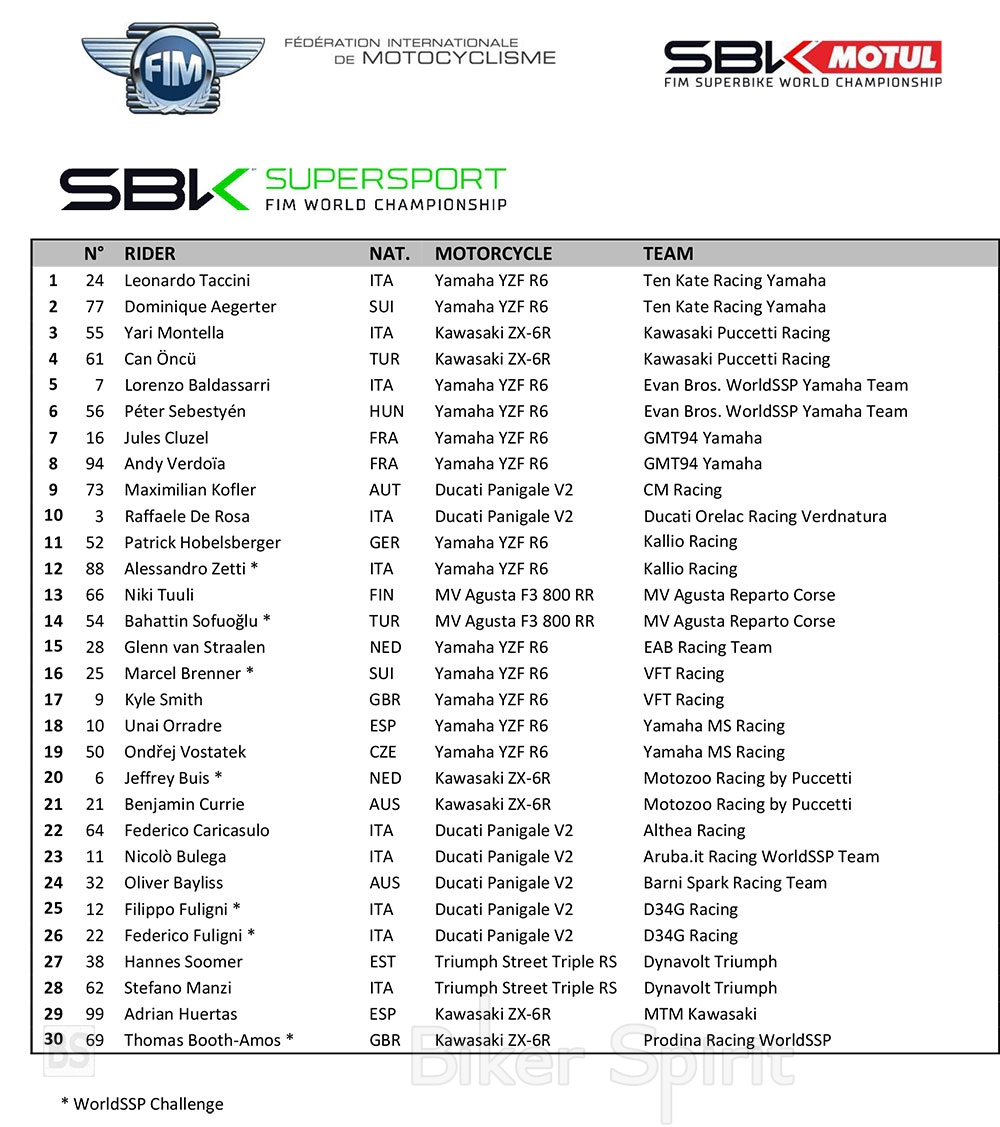 Οι 30 αναβάτες που θα αγωνιστούν στο Παγκόσμιο Πρωτάθλημα FIM Supersport έχουν επιβεβαιωθεί με την κυκλοφορία του προσωρινού καταλόγου εισόδου για την σεζόν του 2022.