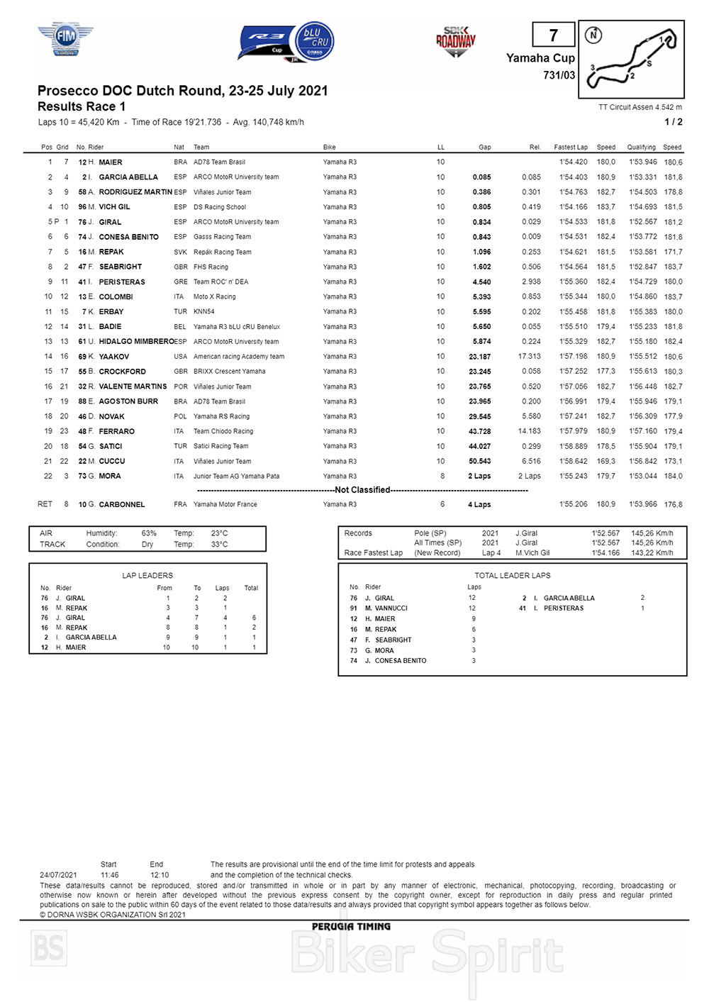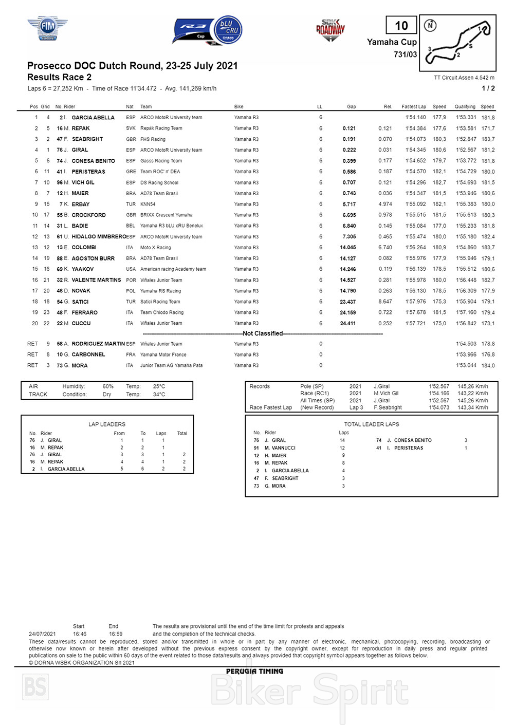 O Γιάννης Περιστεράς με μια ηρωική προσπάθεια πάνω τη “λαβωμένη” R3, ξεπερνώντας με την οδήγησή του τα προβλήματα κρατήματος, κατάφερε όχι μόνο να βελτιώσει το χρόνοι γύρου που είχε κάνει στις Κατατακτήριες δοκιμές, αλλά και να δώσει μέχρι το τέλος τη μάχη για το βάθρο, τερματίζοντας μόλις μισό δευτερόλεπτο από τον νικητή Garcia Abella, στην 6η θέση. Ο υπεύθυνος της οργάνωσης Αλμπέρτο Μπαρότσι του έδωσε τα εύσημα για τον τρόπο που ξεπέρασε τα προβλήματα της μοτοσυκλέτας, οι θεατές χειροκρότησαν θερμά τον Έλληνα οδηγό και ο Ιταλός αρχιμηχανικός του δήλωσε πολύ ευχαριστημένος.