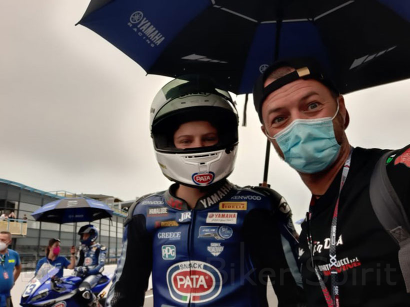 Στον δεύτερο Αγώνα της ημέρας, βρέθηκε αμέσως στο γκρουπ των πρώτων, όμως ήταν ένα από τους πολλούς που παρέσυρε σε πτώση ένας οδηγός που έπεσε ακριβώς μπροστά του. Ο αγώνας διακόπηκε με κόκκινη σημαία και ο Έλληνας σήκωσε γρήγορα τη μοτοσυκλέτα του και μπήκε στα πιτς για τις απαραίτητες επισκευές. Ο χρόνος που μεσολάβησε μέχρι την επανεκκίνηση ήταν μικρός και έτσι η ομάδα αποφάσισε να συνεχίσει με τη μοτοσυκλέτα του να έχει στραβό το πιρούνι της Yamaha R3.