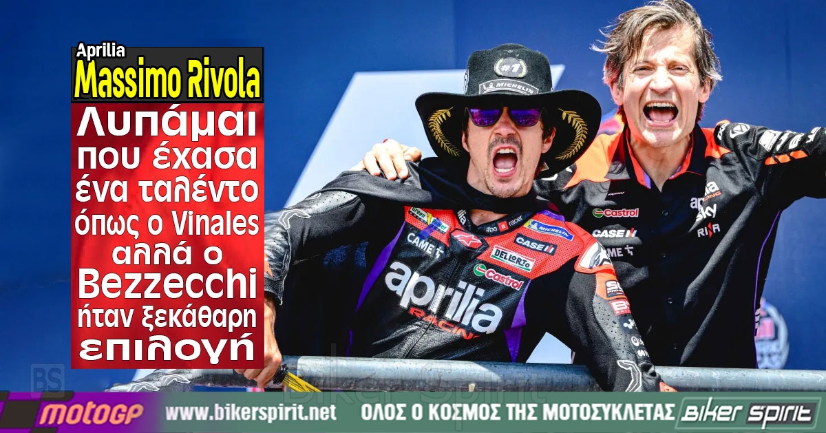 Ο Διευθύνων Σύμβουλος της Aprilia Racing, Massimo Rivola, παραδέχεται ότι είναι λυπημένος που βλέπει τον Maverick Vinales να αποχωρεί, αλλά είναι «πολύ χαρούμενος» που υπέγραψε με τον Marco Bezzecchi στη θέση του για το MotoGP το 2025.