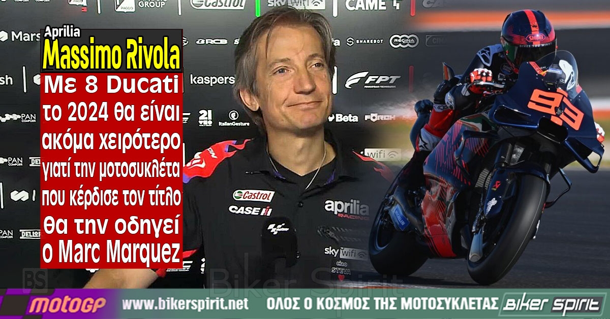 Η Aprilia έκλεισε τη σεζόν του 2023 στην 6η και 7η θέση με τους Aleix Espargaro και Maverick Vinales ενώ τερμάτισε τρίτη στο πρωτάθλημα κατασκευαστών. Οκτώ Ducati στην πίστα με την προσθήκη του Marc Marquez για το 2024, ανησυχούν τον Massimo Rivola, CEO της Aprilia Racing.
