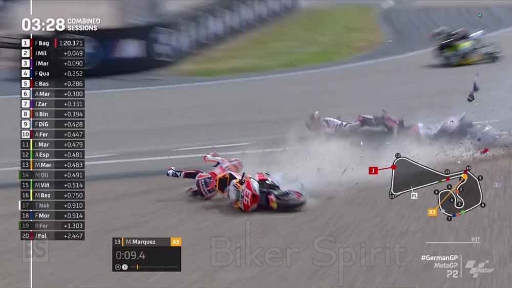 Ο Marquez έχασε το μπροστινό της Honda για τη στροφή 1 στο P2, στο Sachsenring, με αποτέλεσμα να χτυπήσει στο πλάι της Pramac Ducati του Zarco, με την μοτοσυκλέτα του Zarco να κόβετε στα δυο, αλλά και οι δύο αναβάτες βγήκαν αλώβητοι, ενώ ο Marquez μίλησε για την πτώση λέγοντας πως ο Γάλλος δεν κοίταζε πού πήγαινε,(δείτε εδώ >>), ενώ ο Zarco απάντησε ότι είναι γελοίο να ρίχνει την ευθύνη πάνω του ο Marquez. (δείτε εδώ >>)