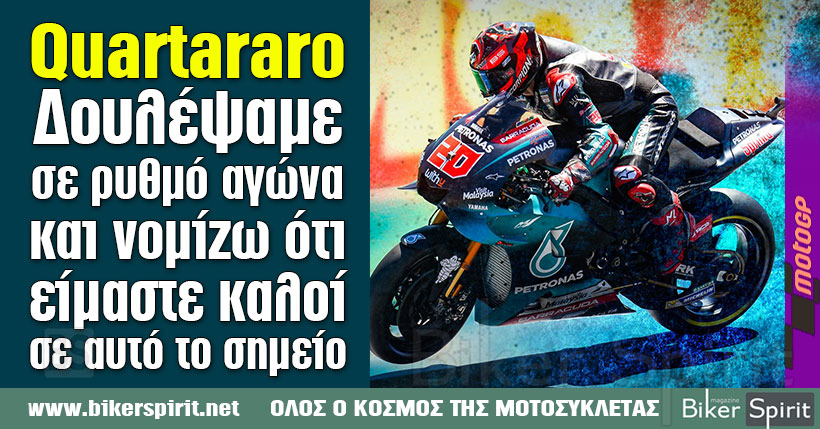 Maverick Viñales: «Είμαι πολύ χαρούμενος με το χρόνο. Ήταν πολύ δύσκολο σήμερα, ήταν ολισθηρά. Είμαι χαρούμενος που βρίσκομαι στην πρώτη σειρά. Δουλέψαμε καλά όλο το Σαββατοκύριακο και αύριο ελπίζω να έχουμε μια καλή αίσθηση, όπως στη Βαρκελώνη.»