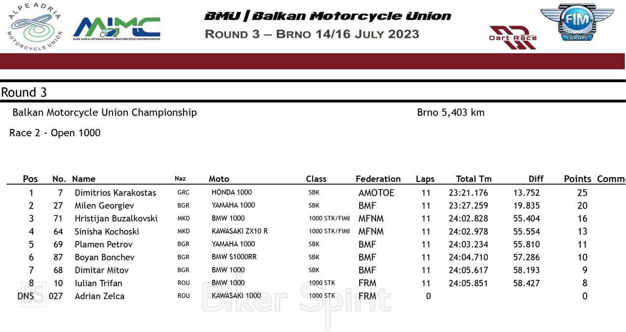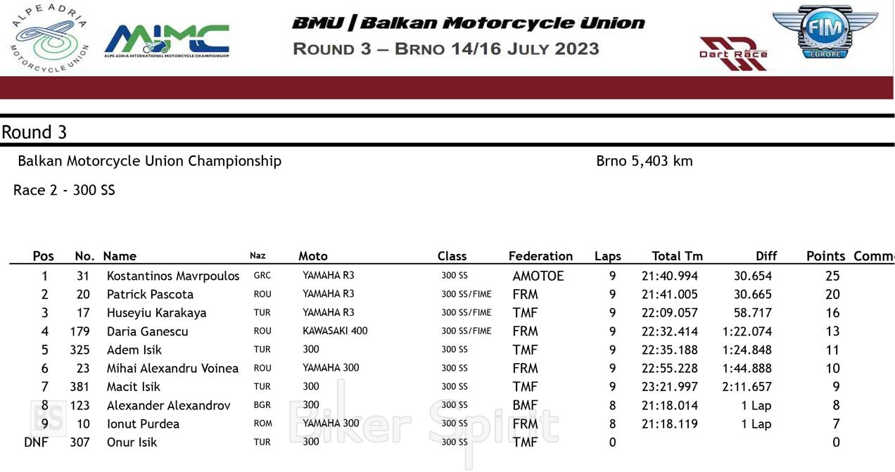 Ο Μαυρόπουλος κάνοντας μια πολύ καλή εκκίνηση και πάλι κατάφερε και μπήκε στην κορυφαία δεκάδα από την αρχή του αγώνα και μετα από αρκετές μάχες κατάφερε να τερματίσει στην 9η θέση της γενικής κατάταξης και την 1η του Βαλκανικού Πρωταθλήματος Ταχύτητας, μπροστά από τον βασικό του ανταγωνιστή στο Βαλκανικό, Patrick Pascota, κερδίζοντας άλλους 25 βαθμούς στο πρωτάθλημα BMU 2023 που τον φέρνει στην κορυφη της κατάταξης της κατηγορίας SSP300, με 119 βαθμούς, και με 15 βαθμούς διαφορά από τον δεύτερο Pascota.