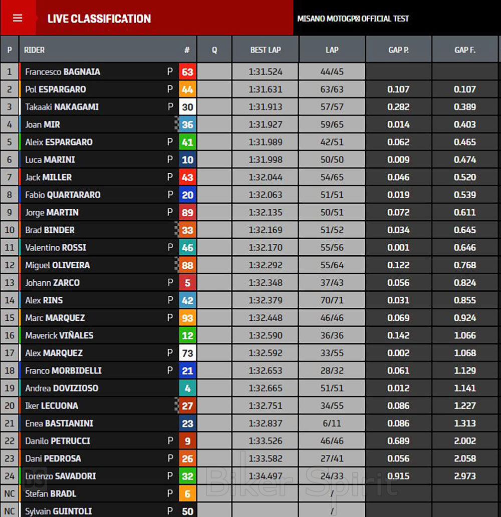 Επιστρέφοντας στους χρόνους ο Bagnaia προηγήθηκε του Honda του Pol Espargarò με 0,107 δευτερόλεπτα, το οποίο με τη σειρά του προηγείται του Takaaki Nakagami και του Suzuki του Joan Mir.