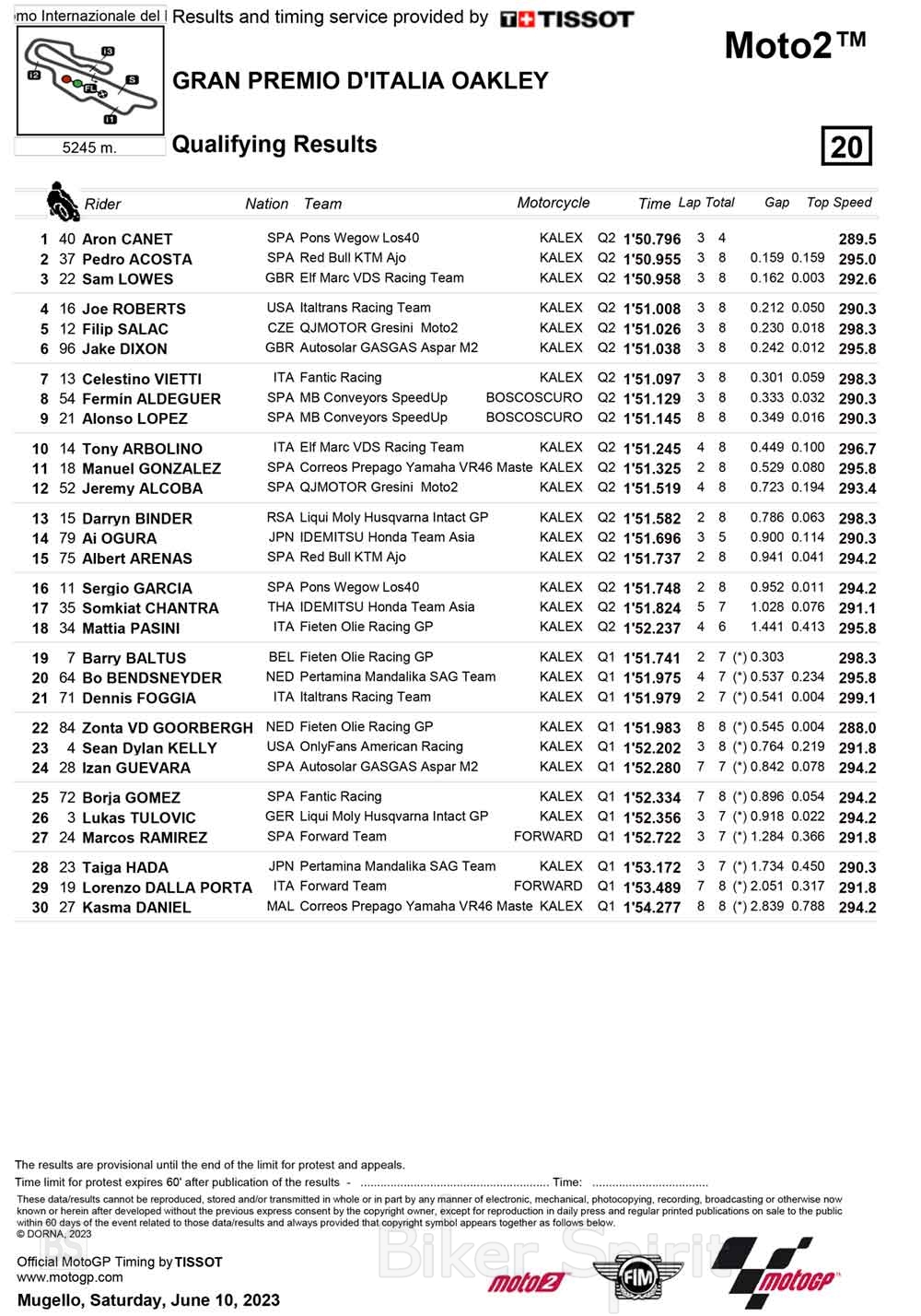 Ο Aron Canet κέρδισε την pole position του 6ου αγώνα της κατηγορίας Moto2, του Παγκοσμίου Πρωταθλήματος 2023 που θα γίνει στο Mugello.