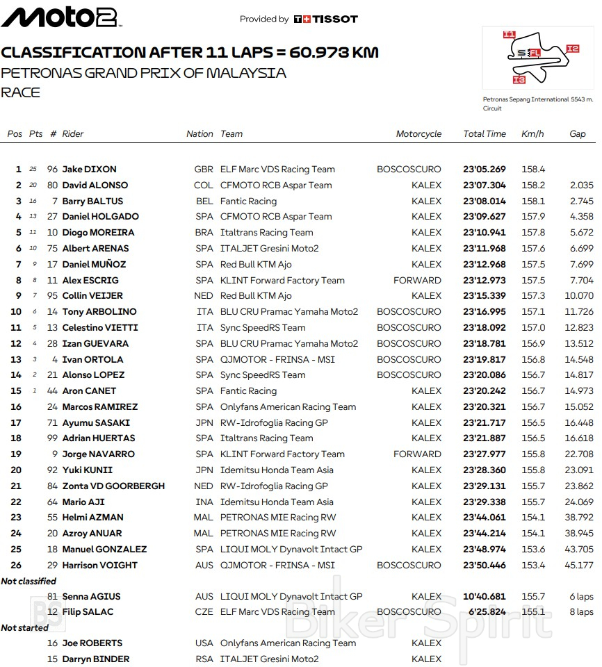 Η κατηγορία Moto2 ολοκλήρωσε το Grand Prix της Μαλαισίας με έναν αγώνα γεμάτο ανατροπές και εντάσεις που βρήκε νικητή τον Jake Dixon. Ο Βρετανός αναβάτης της ELF Marc VDS Racing Team πραγματοποίησε έναν καταπληκτικό αγώνα στη δεύτερη εκκίνηση, μετά τη διακοπή με κόκκινη σημαία, κατακτώντας την πρώτη του νίκη στη Sepang στη Moto2.