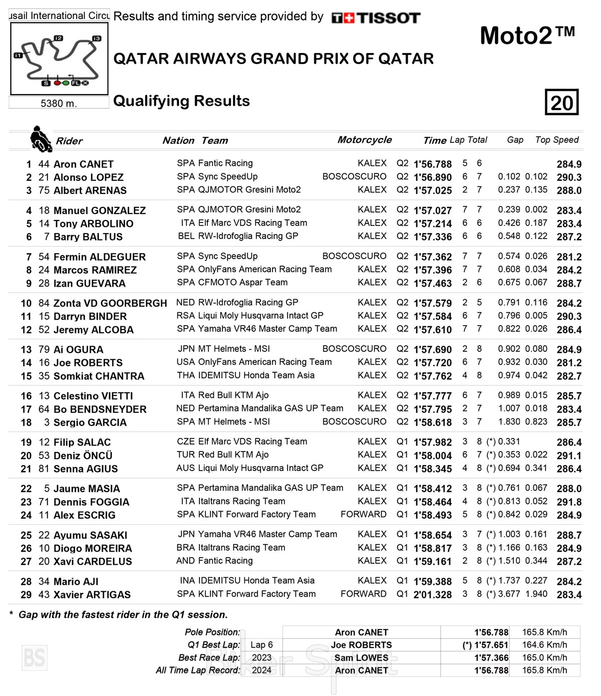 Ο Aron Canet κέρδισε την πρώτη pole position της σεζόν της κατηγορίας Moto2 στο Κατάρ, για την σεζόν 2024 που διεξάγεται στη διεθνή πίστα Lusail.