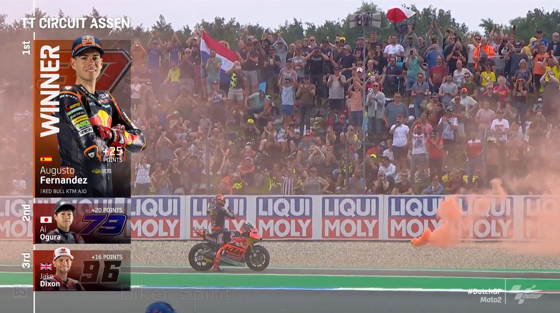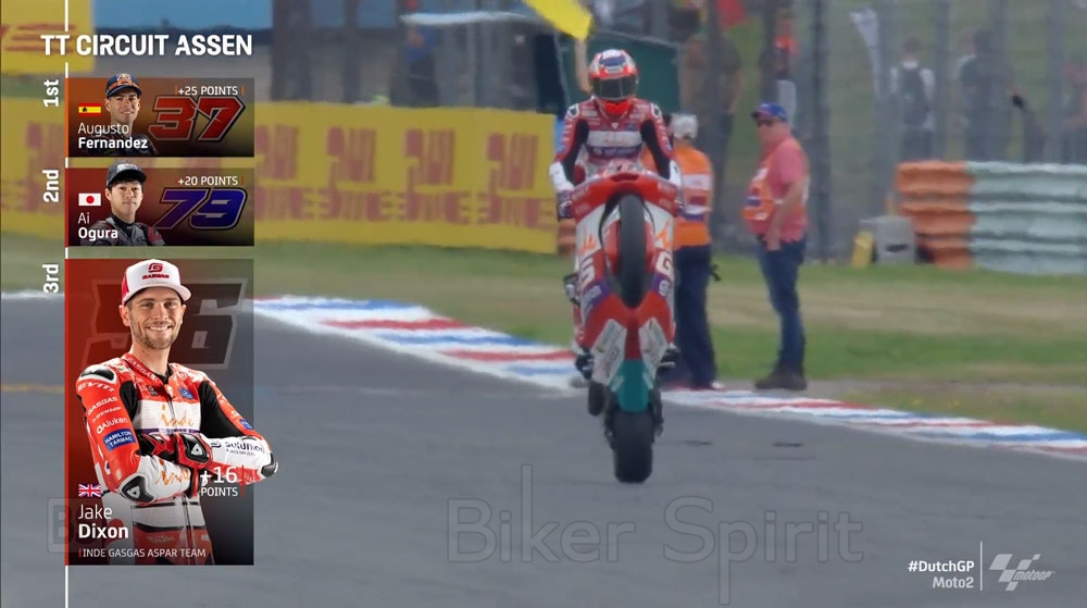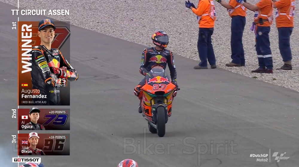 Ο αναβάτης της Red Bull Ajo Team, που ξεκίνησε από την τρίτη σειρά, από την ένατη θέση, μπόρεσε να ανακτήσει σταδιακά τις θέσεις κάνοντας μια άψογη οδήγηση χωρίς λάθη, κατάφερε να θέσει τον ρυθμό του αγώνα και να κερδίσει την καρό σημαία του Assen και την δεύτερη συνεχομένη νίκη του και την τρίτη της σεζόν.