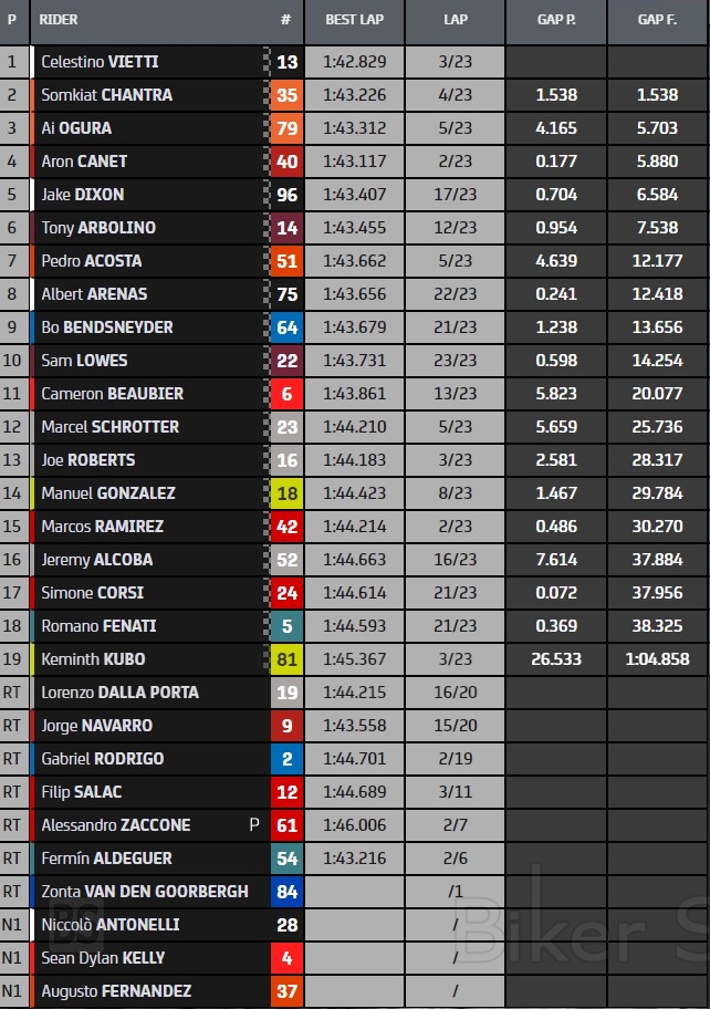 Ο Rookie Pedro Acosta (KTM Ajo) τερμάτισε στην έβδομη θέση μπροστά από τους Albert Arenas και Bo Bendsneyder (SAG). Την πρώτη δεκάδα συμπληρώνει ο Sam Lowes (Marc VdS).