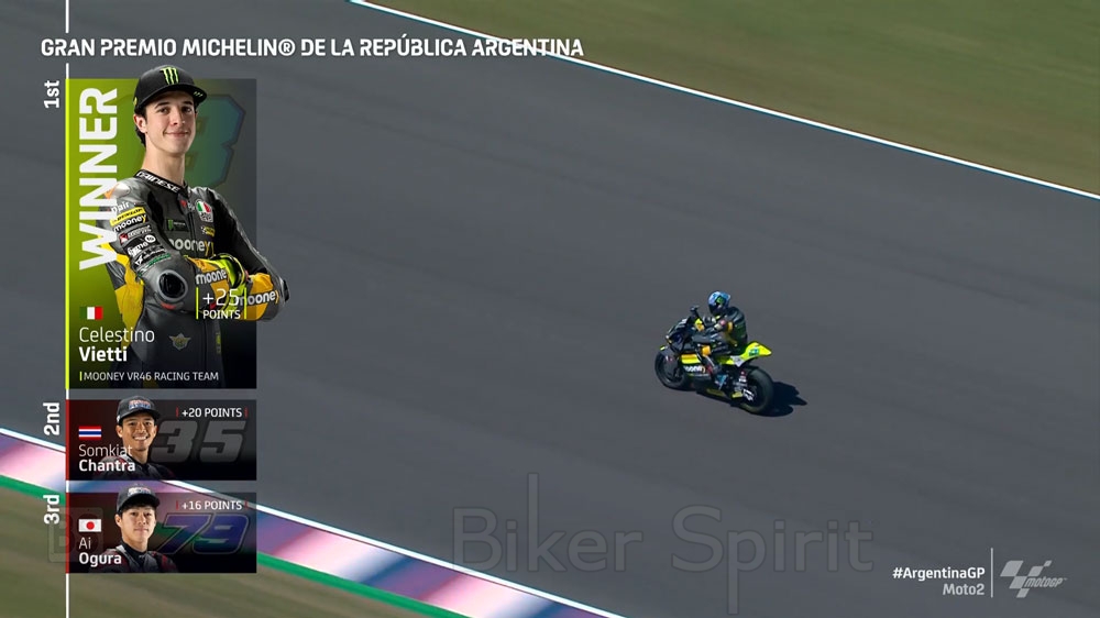 Στους τελευταίους γύρους, ο Celestino Vietti καταφέρνει να κάνει ένα μικρό κενό, κερδίζοντας έτσι το GP της Αργεντινής, τη δεύτερη νίκη του στην καριέρα του.