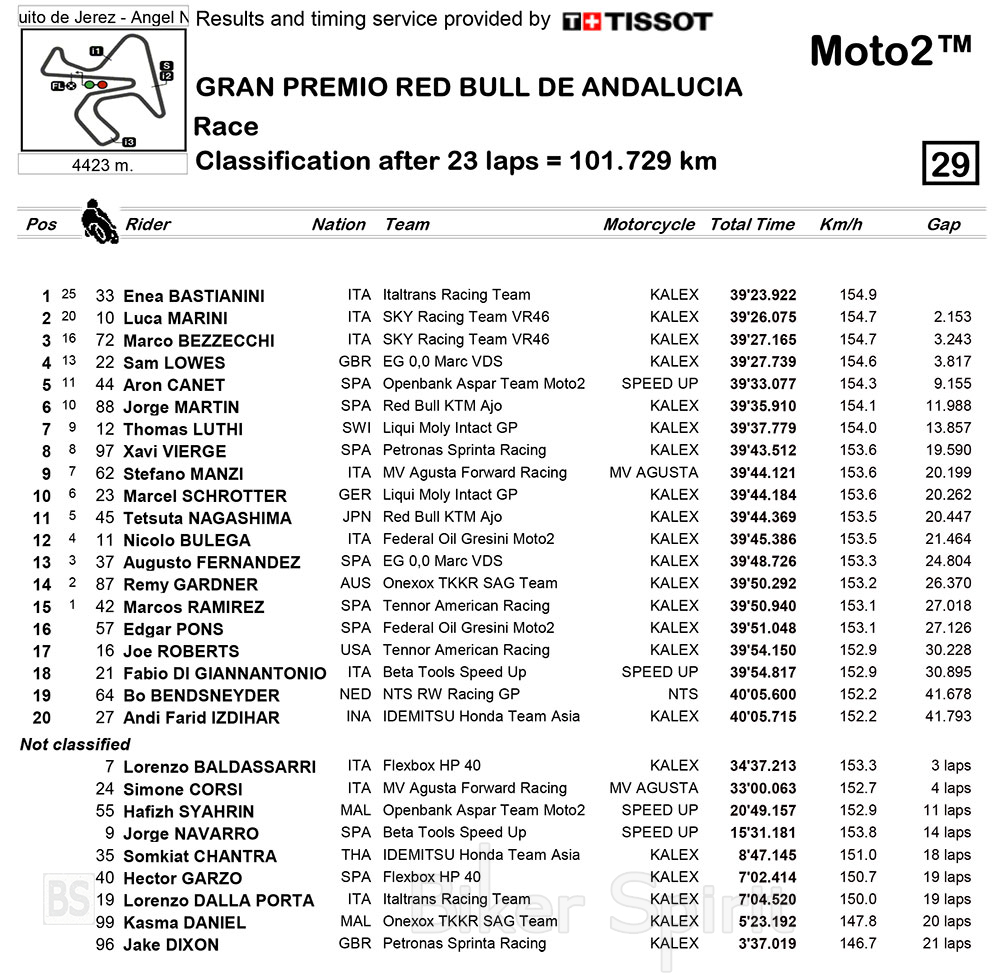 Ο Tom Luthi κλείνει στην έβδομη θέση, μπροστά από τον Xavier Vierge και τον Marcel Schrotter. Ο Tetsuta Nagashima ολοκλήρωσε την κορυφαία δεκάδα της Jerez 2
