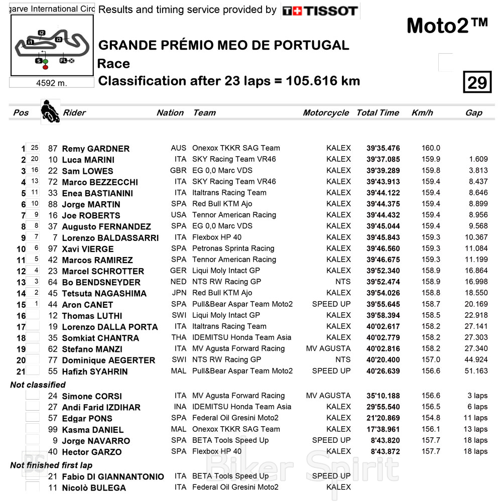 Στο βάθρο ο Luca Marini στην δεύτερη θέση και στην 3η κλείνοντας το βάθρο ο Sam Lowes που, παρά τα προβλήματα του χεριού του, κατάφερε να ολοκληρώσουν τον αγώνα και να ανέβει στο βάθρο.
