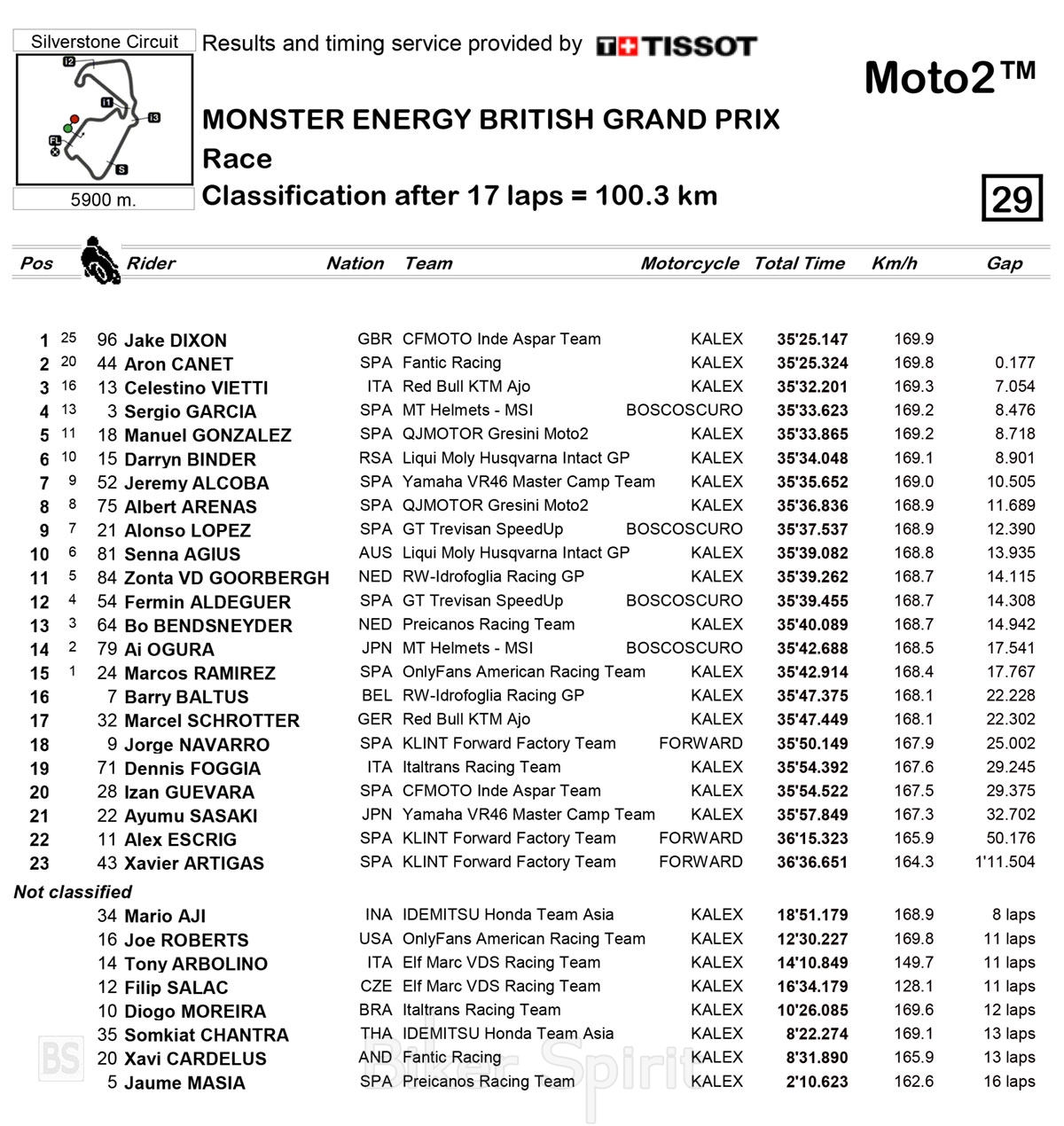 Ο τοπικός ήρωας με το #96 της Team Aspar κέρδισε τον Aron Canet με 0,177 δευτ. στον τελευταίο γύρο, που οδήγησε την αγώνα από την αρχή! Αυτή είναι η τρίτη νίκη στην Moto2 για τον Dixon, και η πρώτη της σεζόν.