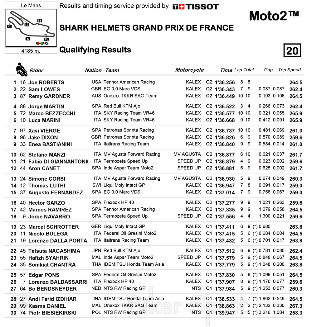 Ο Βρετανός αναβάτης έχασε την pole για μόλις 87 χιλιοστά του δευτερολέπτου, και θα ξεκινήσει από την δεύτερη θέση στην πρώτη σειρά, την οποία κλείνει ο Αυστραλός Remy Gardner, ο οποίος είχε 193 χιλιοστά διαφορά από τον πρώτο.