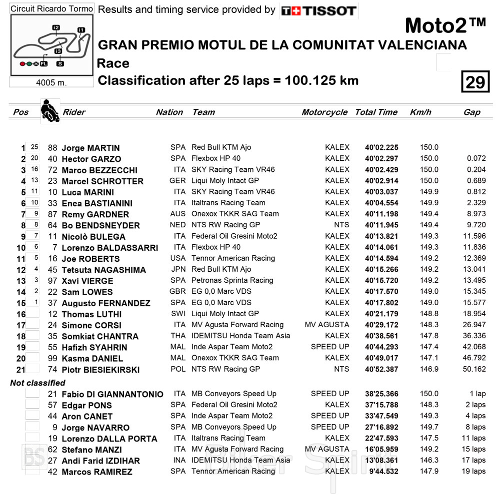 Ο Marcel Schrotter τερμάτισε τέταρτος μπροστά από τον Luca Marini (Sky Racing Team VR46) και τoν Enea Bastianini (ItalTrans) που παραμένει στην κορυφή της βαθμολογίας, μπροστά από τον Sam Lowes, όπου τραυματίας σήμερα μετά την χθεσινή του πτώση (Δείτε το VIDEO εδώ >>) κατάφερε και τερμάτισε 14ος ξεκινώντας από την 18η θέση.