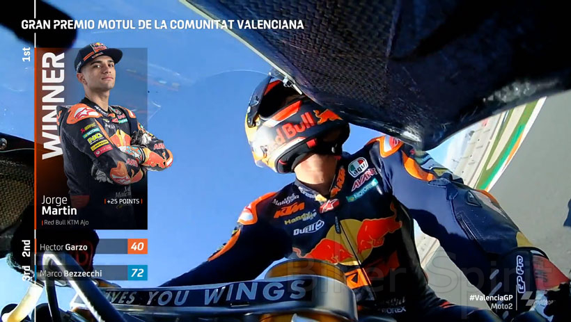 Έτσι το βάθρο διαμορφώθηκε με τον Jorge Martin πρώτο, τον Hector Garzo, και τον πρώτο Bezzecchi να είναι στην 3η θέση και να κλείνει το βάθρο ενώ οδήγησε το μεγαλύτερο μέρος του αγώνα!