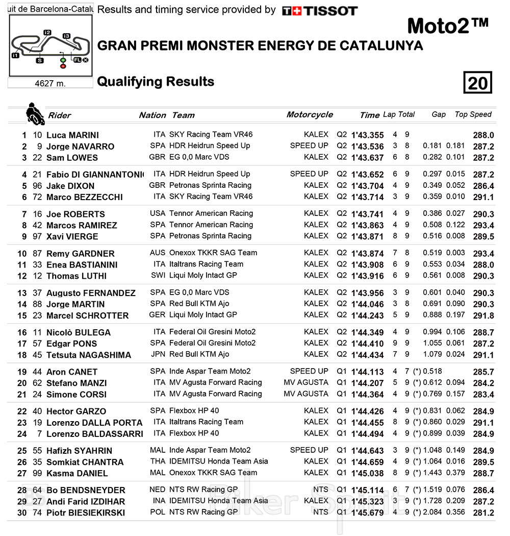 Από την 2η θέση θα ξεκινήσει ο Ισπανός Jorge Navarro (SpeedUp) που έγραψε 1:43.536, μόλις 0.181s πίσω από την κορυφή, ενώ την πρώτη σειρά στην σχάρα εκκίνησης κλείνει ο Βρετανός Sam Lowes (Marc VdS) κατά 0.229s αργότερος από τον πρώτο.