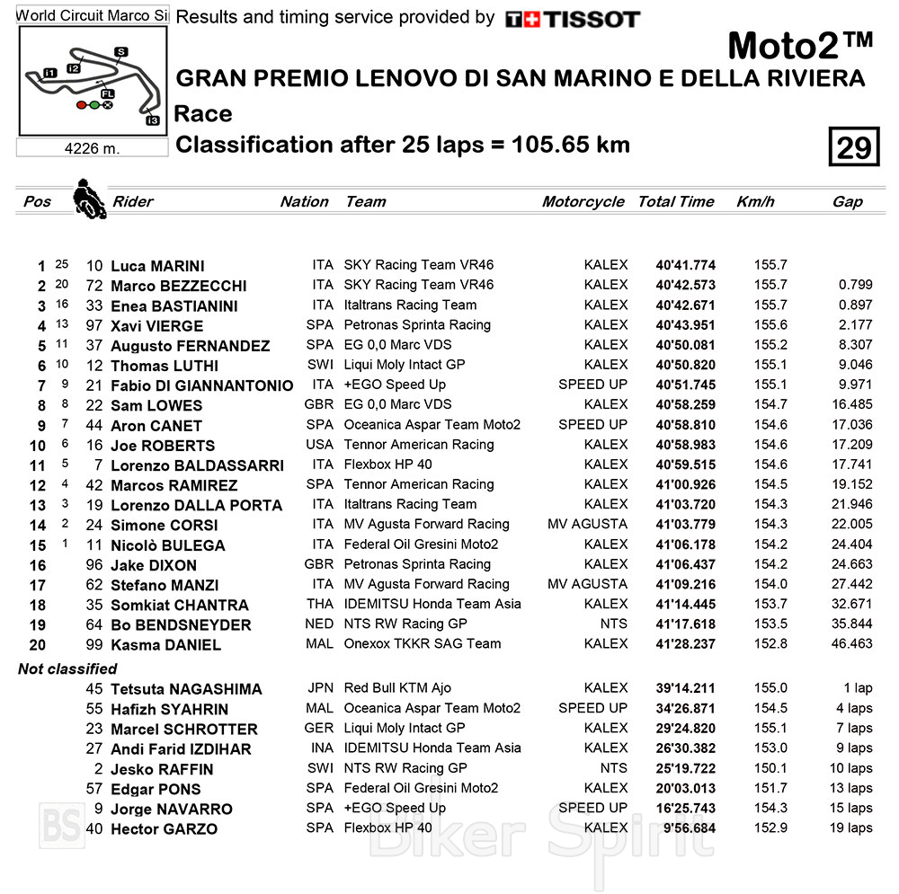 O Luca Marini κέρδισε τον αγώνα τελικά με τον Marco Bezzecchi δεύτερο και τον Enea Bastianini να κλείνει ένα ιταλικό βάθρο του αγώνα στο σπίτι τους!.