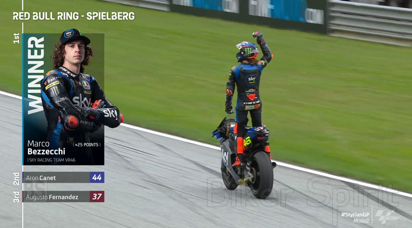 Φανταστικός αγώνας του “Bez” παρά το λάθος του στους πρώτους γύρους που τον έκανε να χάσει δύο θέσεις. Ο οδηγός Ιταλός μπόρεσε να ανακάμψει και να εκμεταλλευτεί επίσης ένα λάθος των Remy Gardner και Ai Ogura και να περάσει πάλι στην κορυφή του αγώνα και να πάρει την καρό σημαία για πρώτη φορά φέτος!