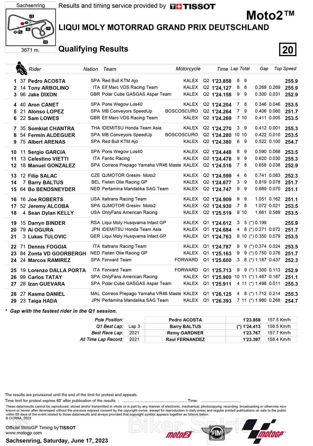 Ο Pedro Acosta κατέκτησε την pole position του Γερμανικού Grand Prix της κατηγορίας Moto2, για τον έβδομο αγώνα του Παγκοσμίου Πρωταθλήματος 2023.