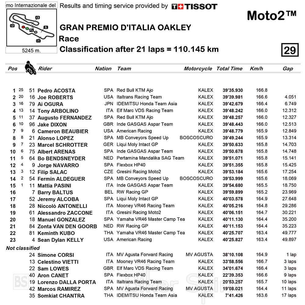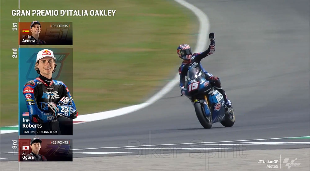 Ο αναβάτης της Red Bull Ajo Team διέσχισε τη γραμμή τερματισμού με μεγάλη διαφορά από τον δεύτερο που ξεπέρασε τα 4 δευτερόλεπτα, πετυχαίνοντας την πρώτη του νίκη στην Moto2 και έγραψε Ιστορία, αφού έγινε ο νεότερος οδηγός που κέρδισε στην ενδιάμεση κατηγορία, σπάζοντας το ρεκόρ που κατείχε από το 2011 ο Marc Marquez!