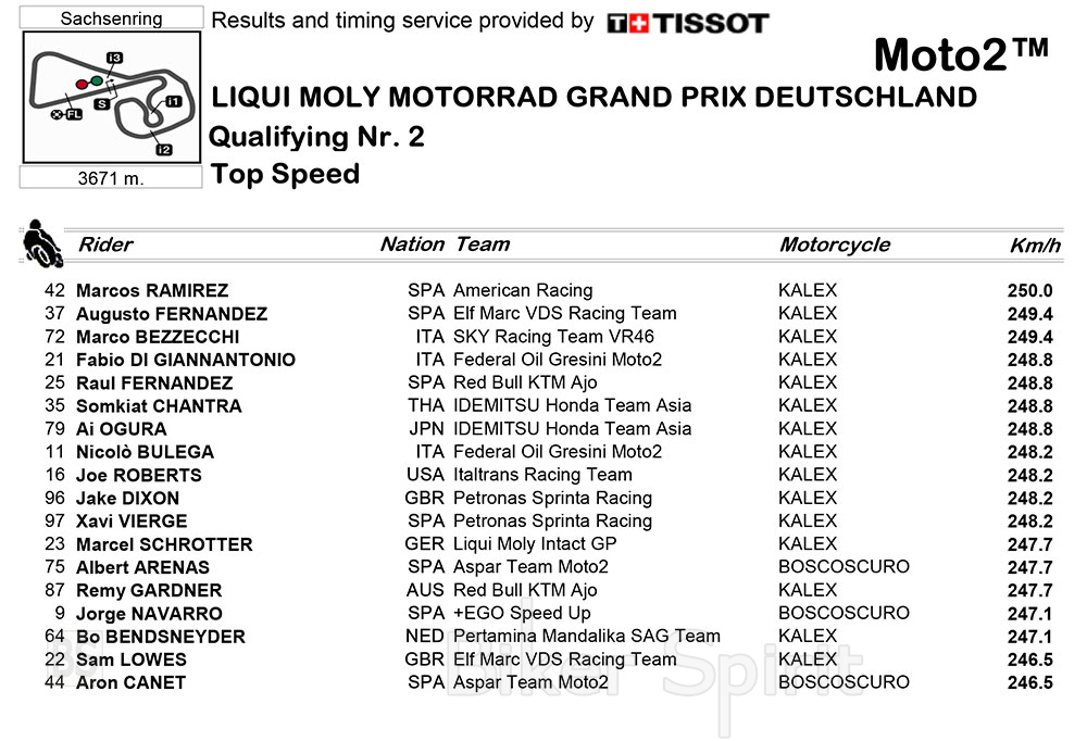 Ο Sam Lowes, όπου είχε μιας πτώση, ευτυχώς χωρίς συνέπειες, θα ξεκινήσει από την έβδομη θέση, μπροστά από τον Ai Ogura (Honda Team Asia) και τον Bo Bendsneyder (SAG). Ο Aron Canet (Aspar) ολοκληρώνει τους δέκα πρώτους.