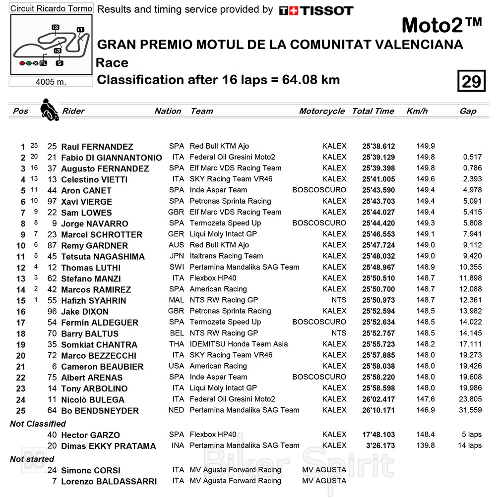 Μετά από μια μακρά μάχη, ο Raul Fernandez έκανε το καλύτερο που έπρεπε να κάνει και κέρδισε το GP μπροστά από τον Fabio Di Giannantonio (Gresini) και τον Augusto Fernandez (Marc VDS) που έκλεισαν το βάθρο.