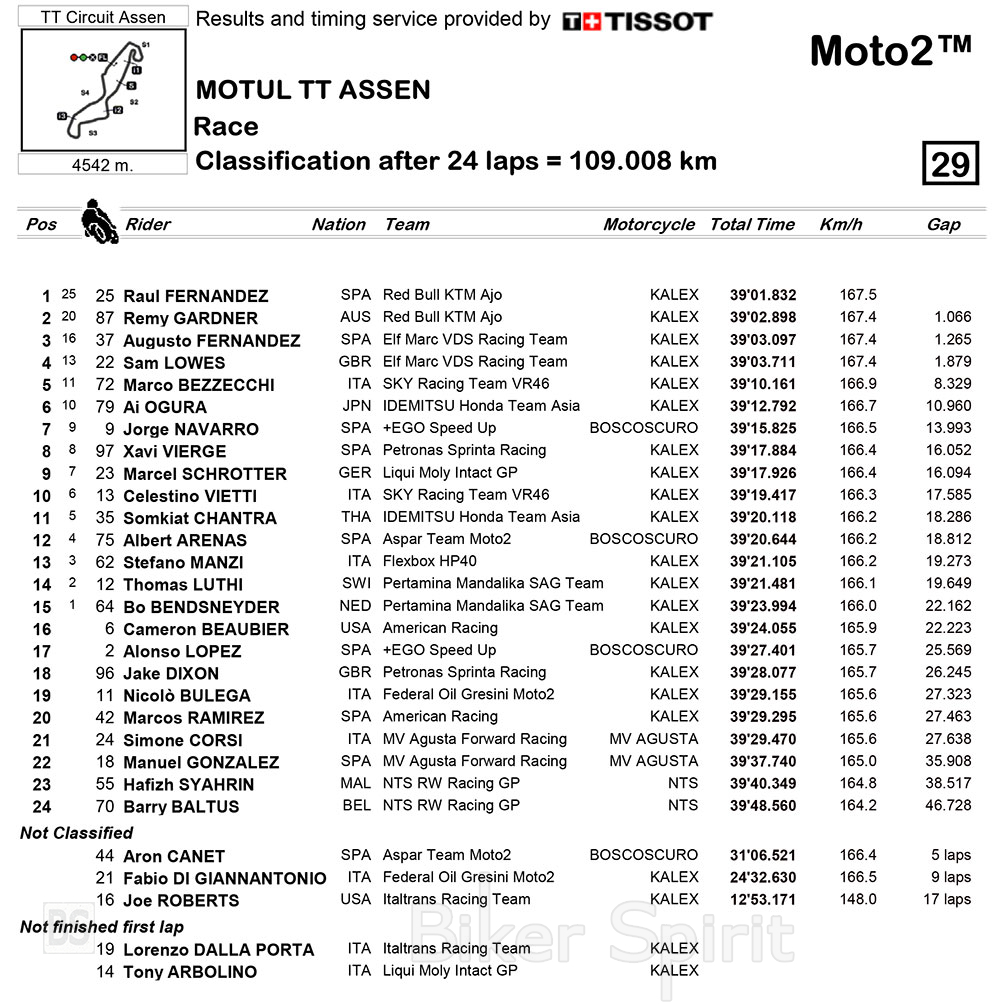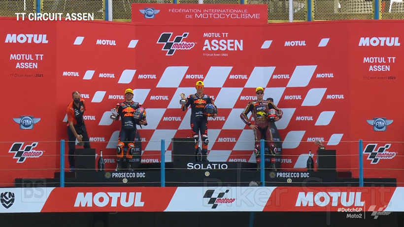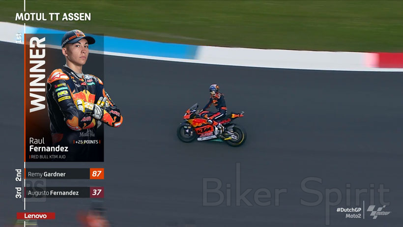 Ο Remy Gardner τερμάτισε στην δεύτερη θέση, κάνοντας το 1-2 για την Red Bull KTM Ajo, νικώντας τον Augusto Fernandez στον τελευταίο γύρο, οπού έκλεισε το βάθρο του αγώνα στο Assen.
