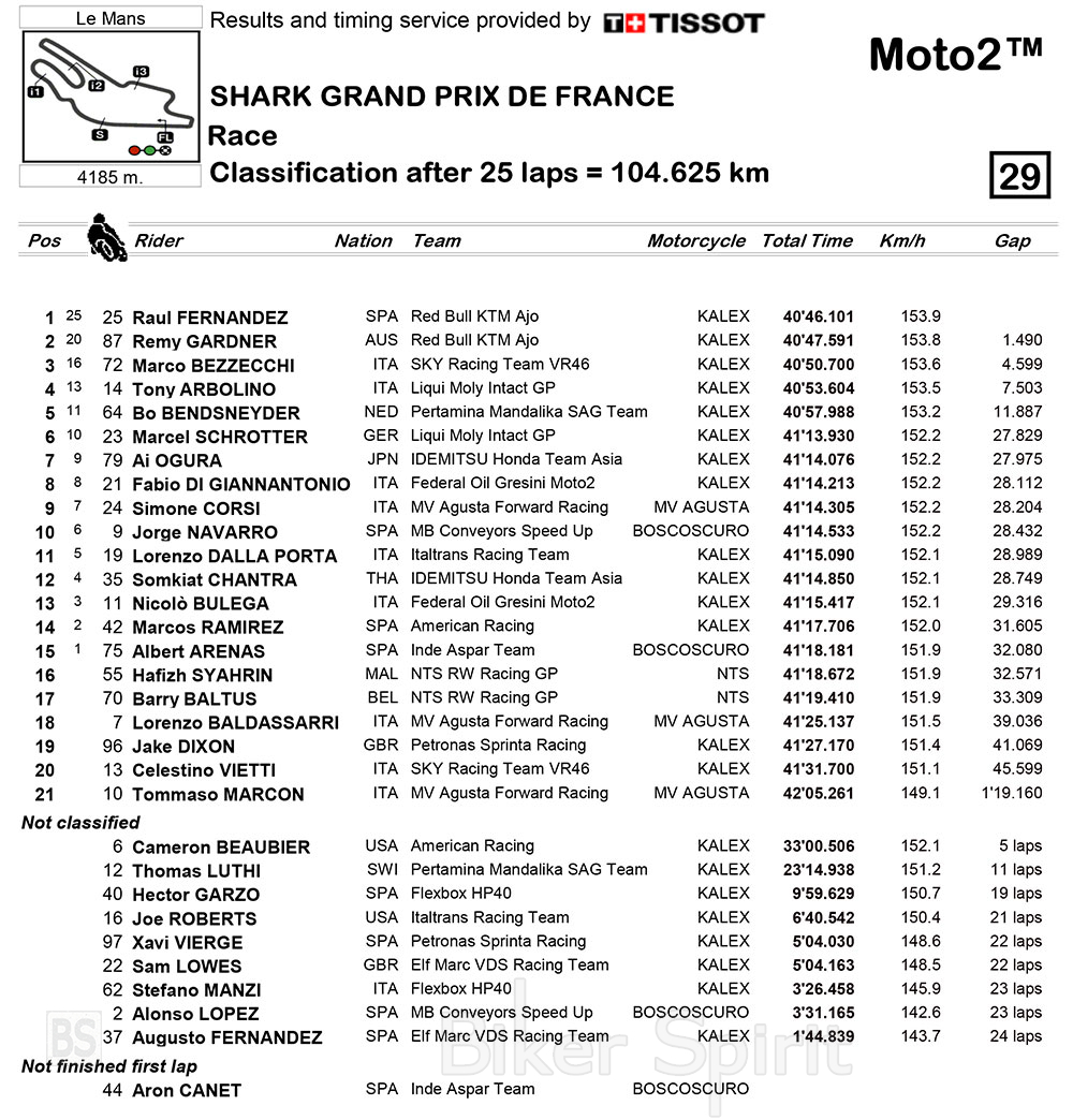Μετά το Γαλλικό GP, ο Remy Gardner συνεχίζει να είναι ο επικεφαλής της βαθμολογίας με έναν βαθμό μπροστά από τον Raul Fernandez.