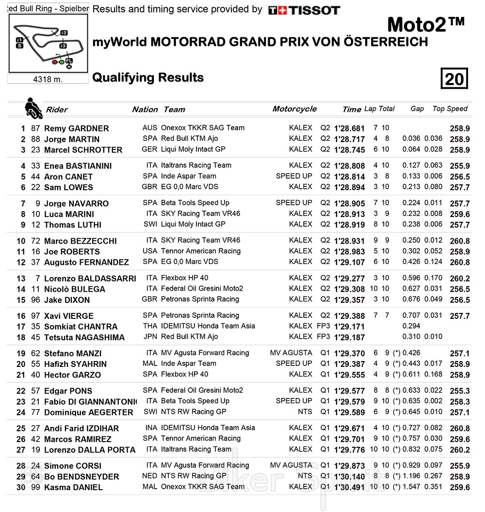 Από την 3η σειρά και την 7η θέση θα ξεκινήσει ο Jorge Navarro, μπροστά από τον Luca Marini και τον Thomas Luthi,ενώ την κορυφαία δεκάδα έκλεισε ο Marco Bezzecchi.