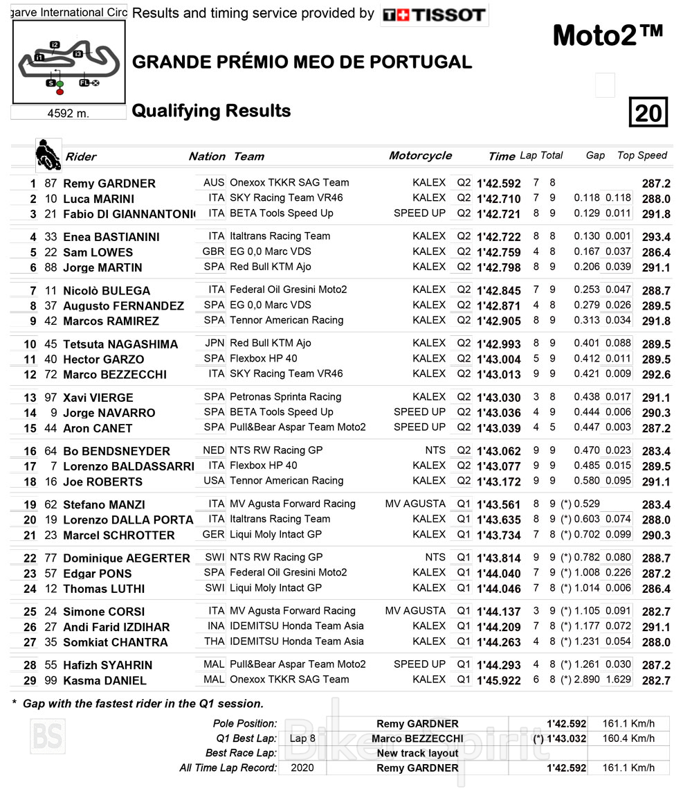 Ο Αυστραλός οδηγός με μια τελική ανατροπή σταματώντας το χρονόμετρο στο 1: 42.592 μπροστά από τον Luca Marini (Sky Racing Team VR46) και τον Fabio Di Giannantonio (Speed Up) που συμπλήρωσε την πρώτη σειρά!