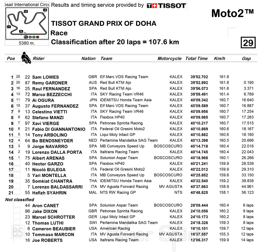 Ο Marco Bezzecchi μας, ο οποίος ξεκίνησε πολύ καλά και οδήγησε τον αγώνα για μερικούς γύρους, προσπάθησε να συμβαδίσει μαζί με τους πρώτους, αλλά δεν τα κατάφερε και τερμάτισε 4ος μπροστά από τον Ai Ogura που κατάφερε στον τελευταίο γυρο να ανεβεί δυο θέσεις και να τερματίσει στην 5η θέση, μπροστά από τον Augusto Fernandez που έκλεισε την κορυφαία εξάδα!