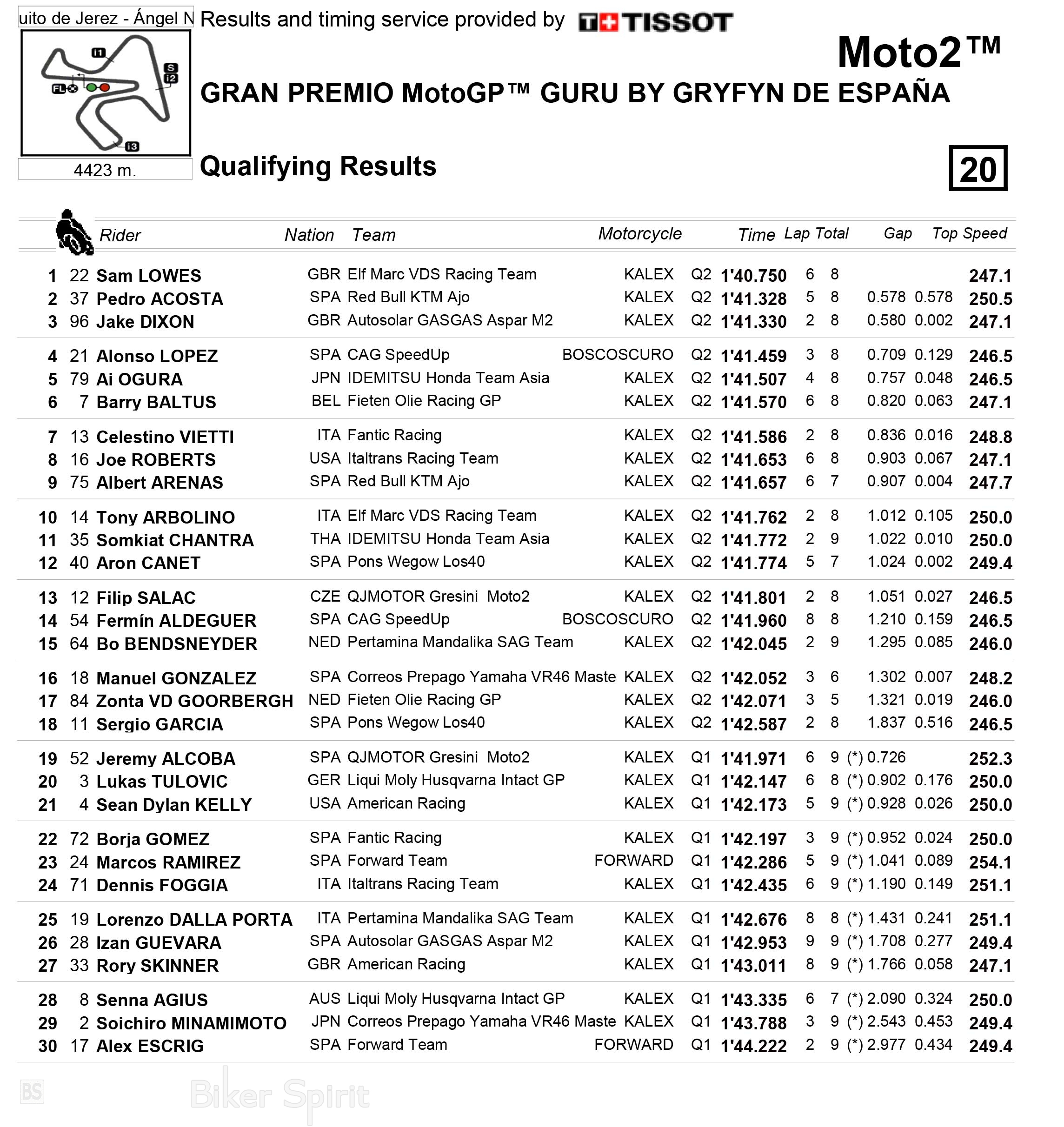 Ο αναβάτης της ομάδας Marc VdS σταμάτησε το χρονόμετρο στο 1:40.750, διαφορά πάνω από μισό δευτερόλεπτο από τον δεύτερο Pedro Acosta (KTM Ajo), ενώ ο Jake Dixon (GASGAS) κλείνει την πρώτη σειρά εκκίνησης στην 3η θέση.