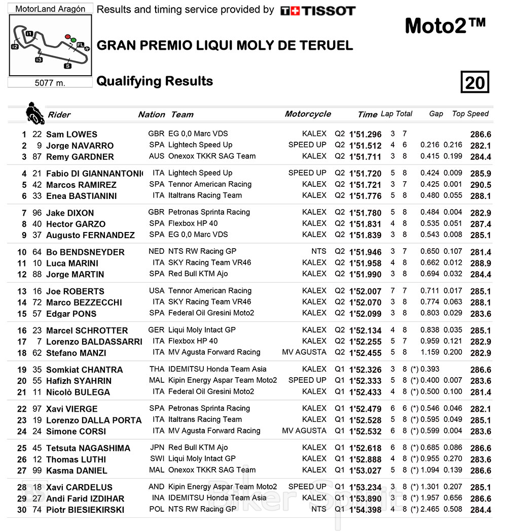 Ο Βρετανός οδηγός σταμάτησε το χρονόμετρο στο 1:51.296, κατακτώντας την δεύτερη συνεχόμενη pole Position και θα εκκινήσει μπροστά από τον Jorge Navarro (Speed Up) και τον Remy Gardner, που έκλεισε την πρώτη σειρά.