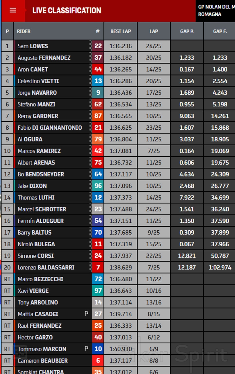 Έβδομος ο Remy Gardner (KTM Ajo), που είχε επαφή με τον Chantra, οπού και έπεσε, και τιμωρήθηκε με ποινή log lap. Ο Αυστραλός πιλότος, χάρη στην πτώση του Φερνάντες, διατηρεί την κορυφή της βαθμολογίας του παγκόσμιου πρωταθλήματος στο +18. Όγδοη θέση για τον Fabio Di Giannantonio (Gresini) ακολουθούμενη από τον Ai Ogura (ομάδα της Honda στην Ασία) και τον Marcos Ramirez (American Racing) που συμπληρώνει την πρώτη δεκάδα.