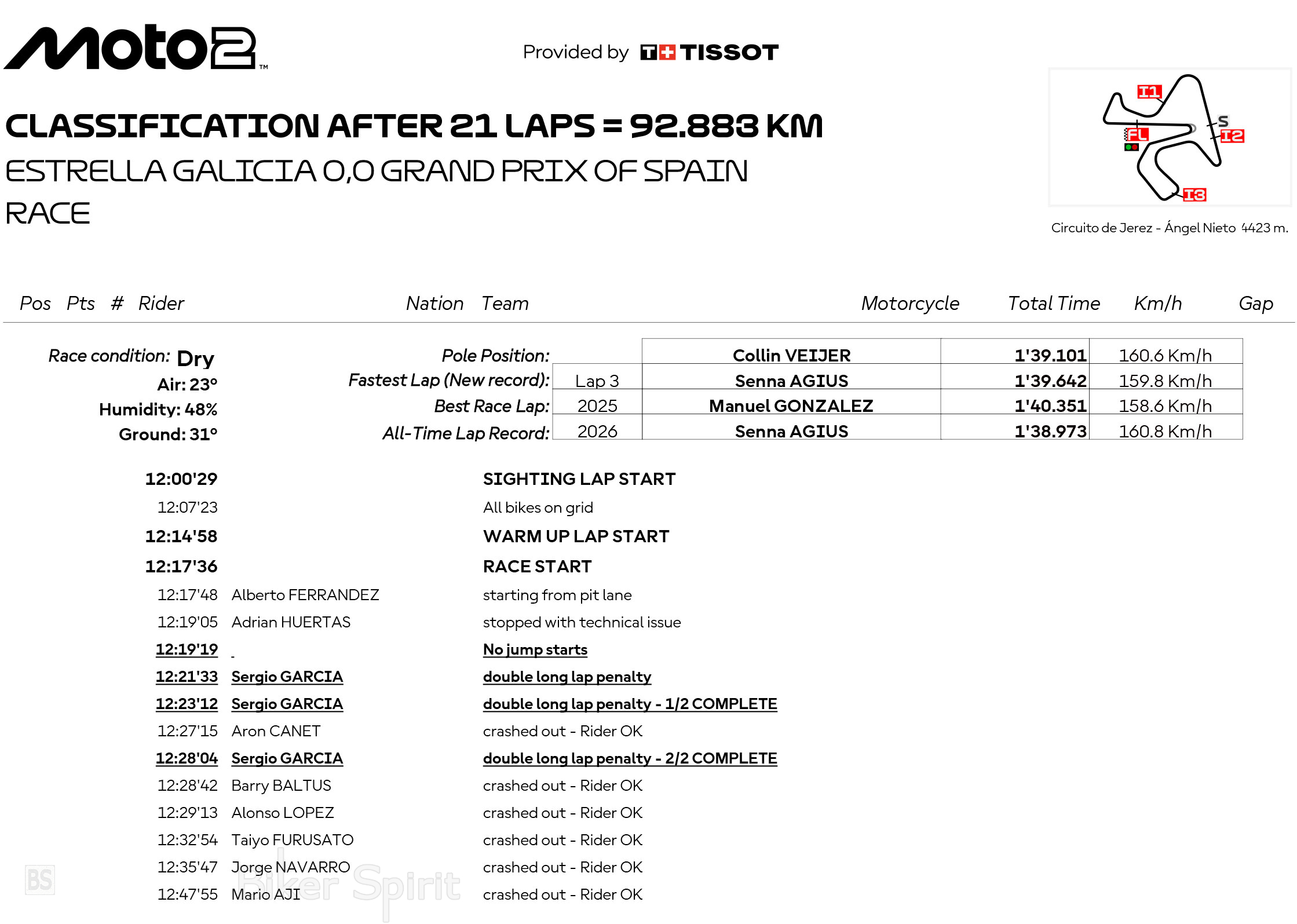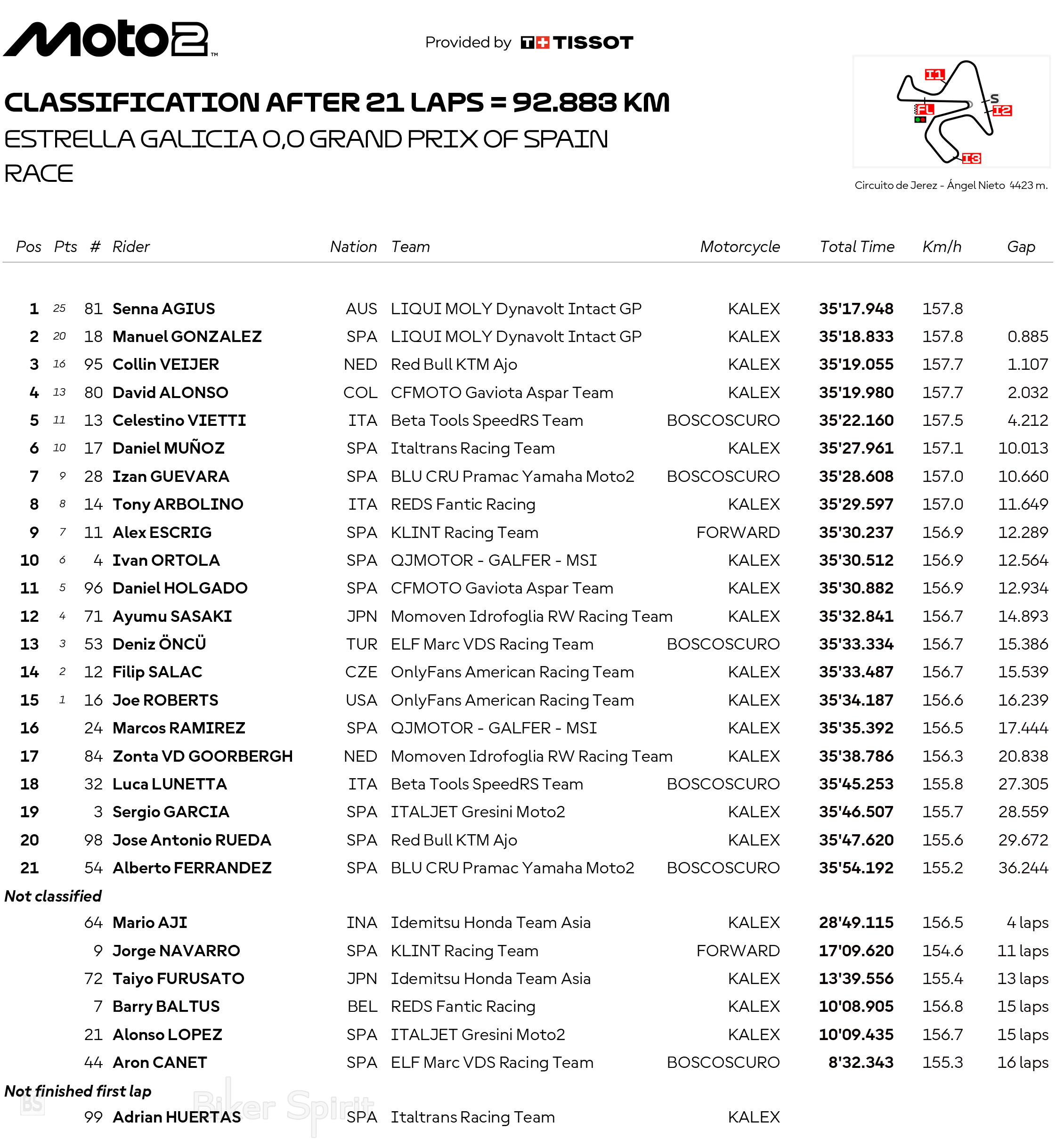 Ο Senna Agius πέτυχε δεύτερη συνεχόμενη νίκη στη Moto2, μετά το COTA και τώρα στην πίστα της Jerez, επικρατώντας σε μια μάχη τριών αναβατών μέχρι το τέλος. Για πρώτη φορά στην καριέρα του στην κατηγορία, ο Αυστραλός φτάνει σε back-to-back νίκες. Ο Manuel Gonzalez χάρισε το 1-2 στην ομάδα, τερματίζοντας δεύτερος και διατηρώντας την πρωτοπορία στο πρωτάθλημα, ενώ ο Collin Veijer πήρε το πρώτο του βάθρο για το 2026 με την τρίτη θέση.
