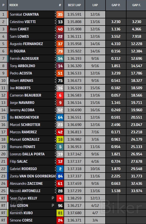 Τέταρτος τερμάτισε ο Sam Lowes (Marc VDS), ο οποίος προηγήθηκε των Augusto Fernandez (Red Bull Ajo), Ai Ogura (Team Asia) και Fermín Aldeguer (Speed Up).