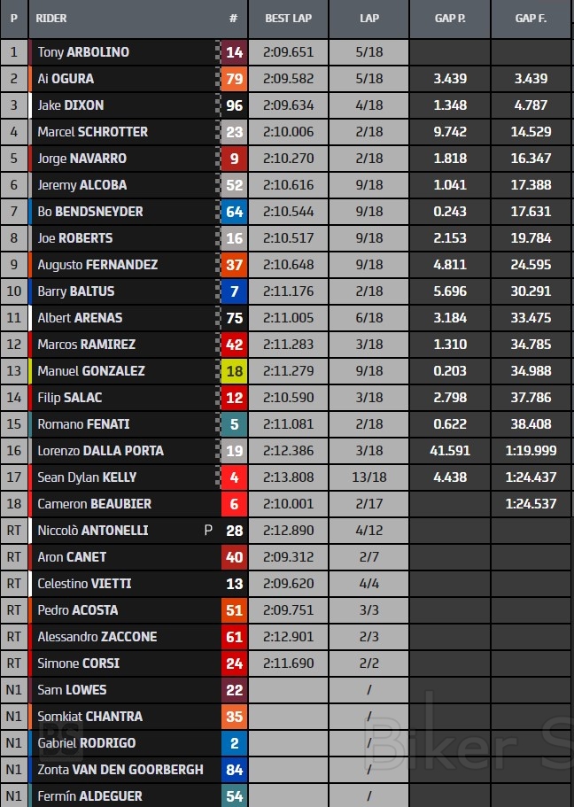 Ο Celestino Vietti παρά την πτώση παραμένει πρώτος στην βαθμολογία με 70 βαθμούς έναντι 56 του Ogura και 54 του Tony Arbolino.